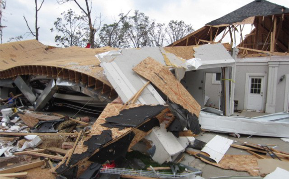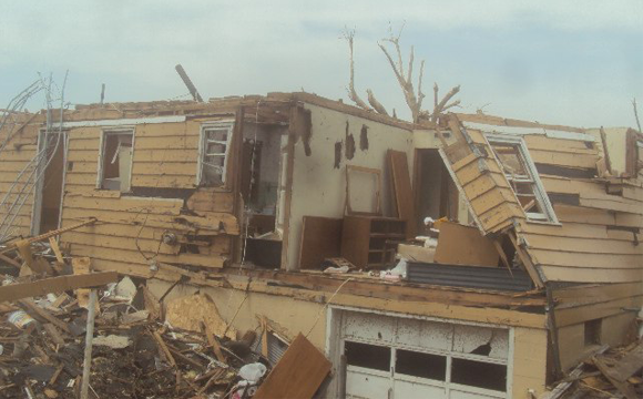 Steve Keeney of Shelter Insurance explains that a 97 year old insured still resided in the home that she and her late husband built in 1958. One of the few homes to have a basement, the insured was unable to get downstairs before the tornado struck – taking off the roof and blowing out the walls. She was in the kitchen and was knocked to the floor, but was shielded from the flying debris by a door that came down across the top of the kitchen counter and the floor forming a cover that provided her protection. Note the boat under the collapsed garage to the left of the photo.