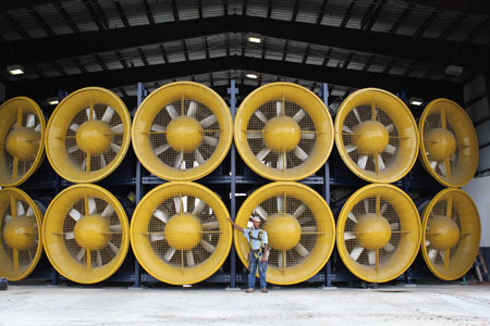 Florida International University’s 12-fan “Wall of Wind” hurricane simulator is on display at the National Building Museum in Washington.