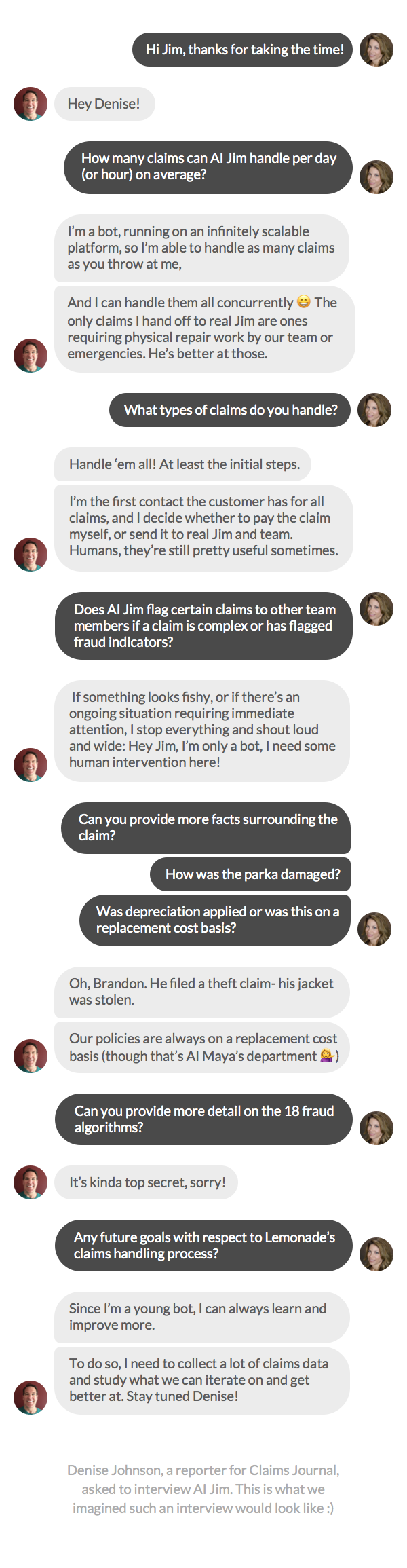 In an effort to learn more about the claims process at Lemonade, Claims Journal set out to interview AI Jim. Here’s what we found out: