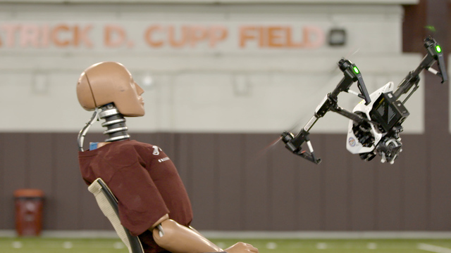 The impact damaged the Phantom’s props, cracked the frame and tore off its camera. Graphs displayed on a computer showed spikes in energy as the craft hit Hank, but more analysis and additional tests will be needed to determine how badly it would hurt a human.