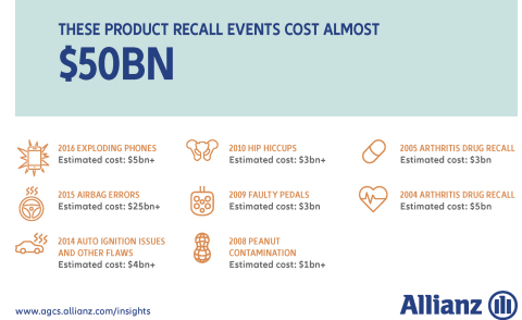 Product Recall: Managing The Impact of the New Risk Landscape analyzes 367 insurance industry product recall claims from 28 countries across 12 industry sectors between 2012 and the first half of 2017. Overall defective product or work is the major cause of recall claims, followed by product contamination. The average cost of a significant incident is in excess of $12 million, with the costs from the largest events far exceeding this total. Over 50 percent of losses arise from 10 incidents. The IT/electronics sector is the third most affected industry after automotive and food and beverage, according to the claims analysis.