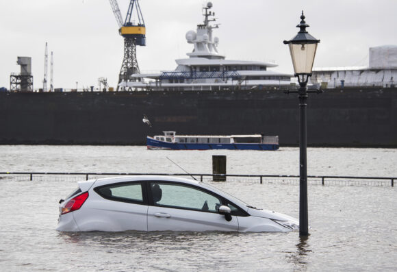 About the photo: A car is surrounded by flood water in Hamburg, Germany, Sunday Jan. 30, 2022, after a powerful winter storm swept through northern Europe over the weekend. (Daniel Bockwoldt/dpa via AP)