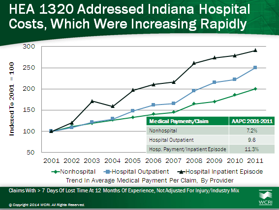 The study, CompScopeMedical Benchmarks for Indiana 14th Edition, found the main reason for higher medical payments per claim was higher and growing prices, like other states with no price regulation. Lower to typical utilization of medical care helped to offset the higher prices paid.