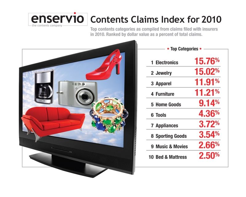 Electronics, jewelry, furniture, apparel, and home goods are among the top five items claimed, according to the findings of the Contents Claim Index (CCI) released by Enservio, a web based software and services provider for property contents claims processing.