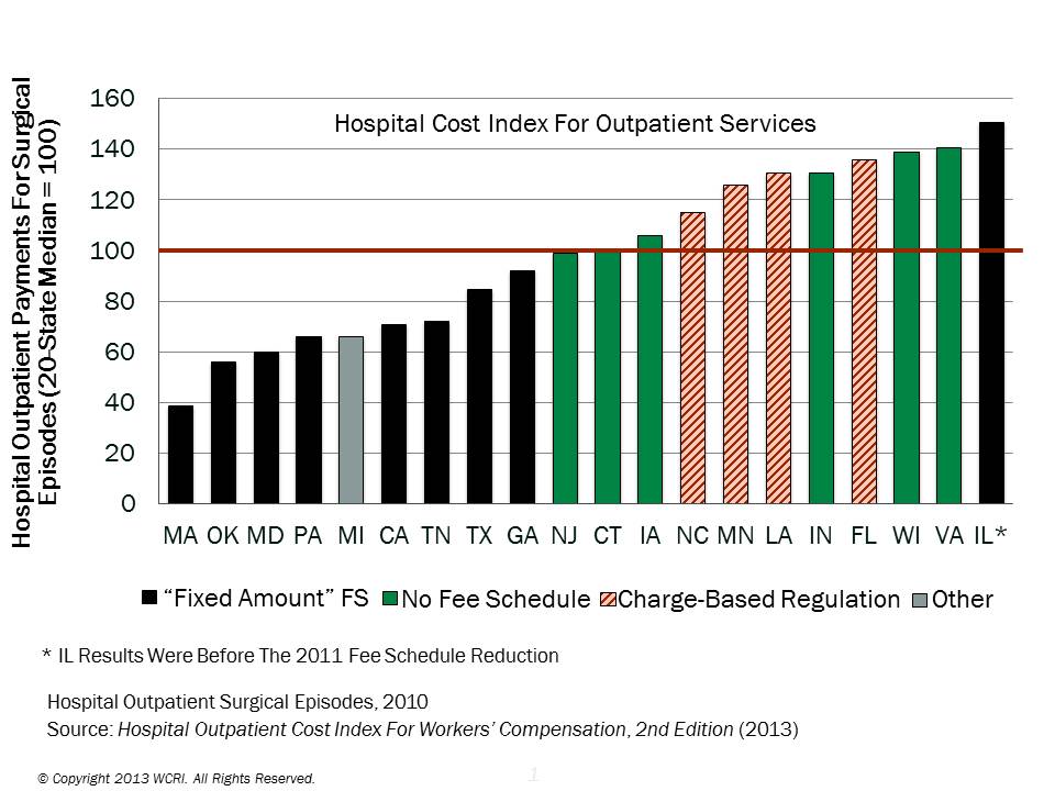 The WCRI researcher found that fee schedules do affecting pricing and that fees paid for professional services varied greatly. States that did not have fee schedules paid more for professional services and hospital outpatient payments, while states that had a fixed amount fee schedule paid less. According to the study, the median states were Louisiana and Arizona. Wisconsin recorded the highest prices paid for professional services.