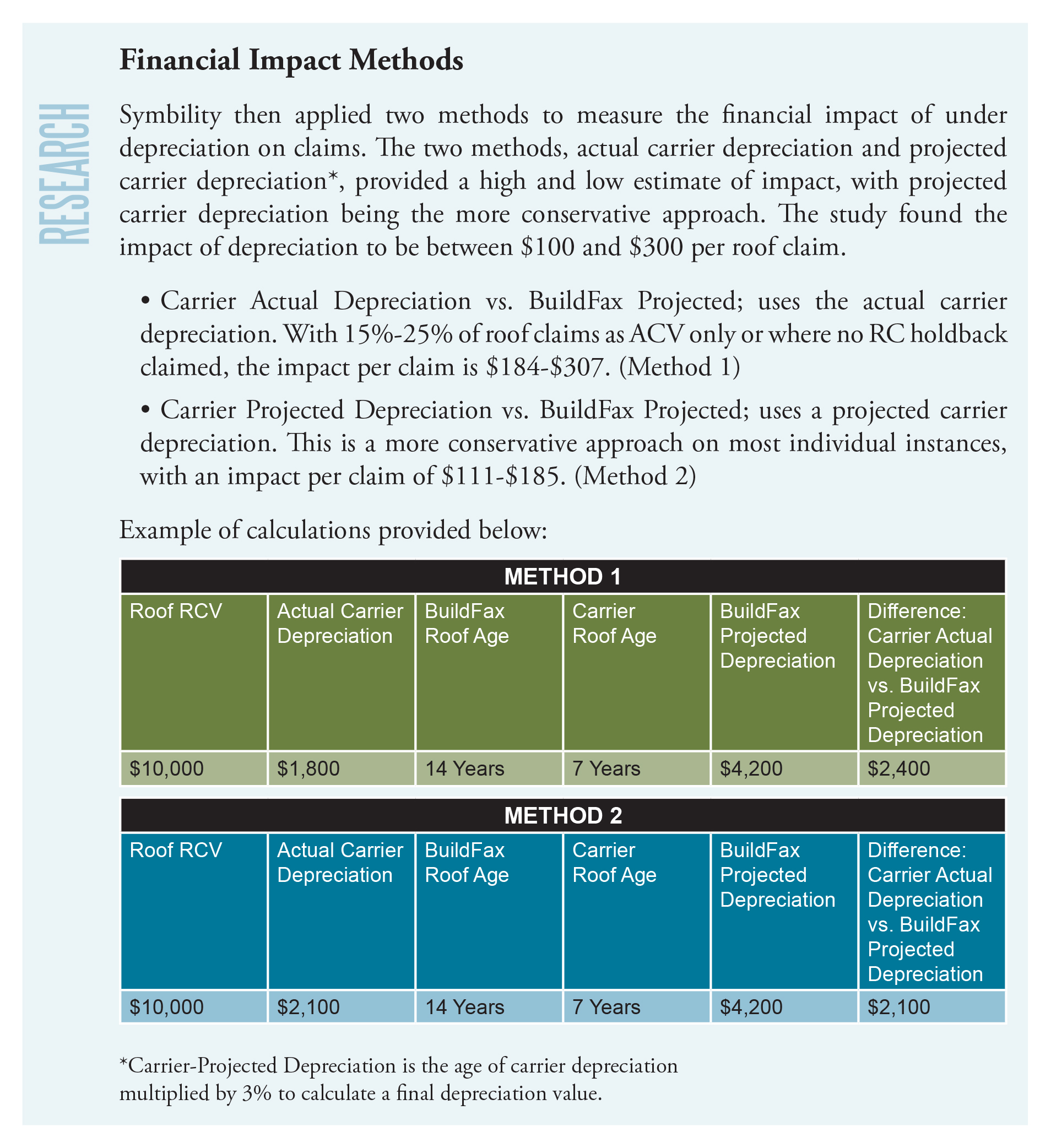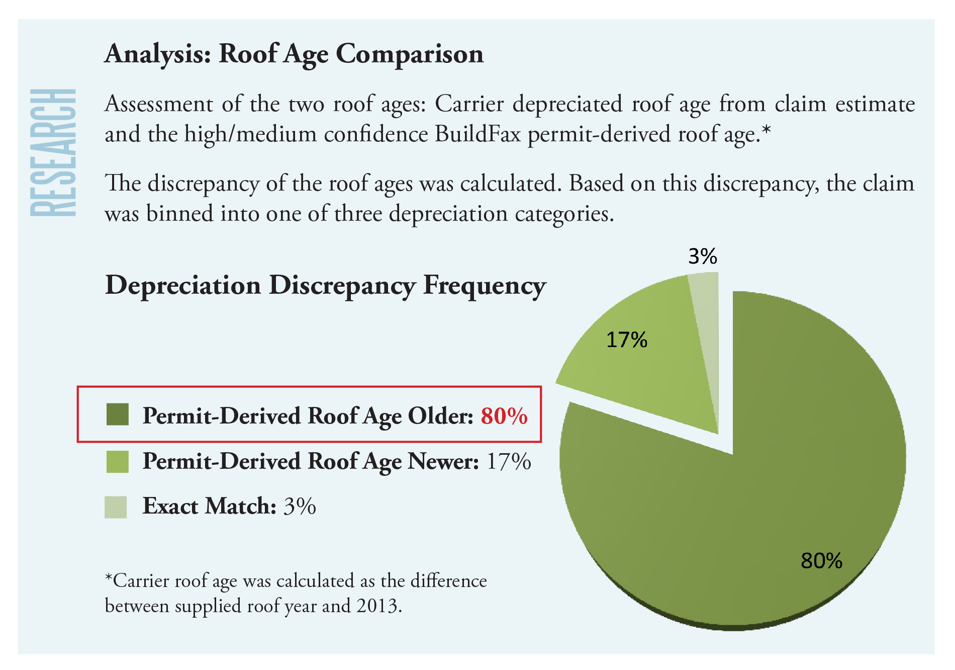 Working with Symbility, a provider of cloud-based and mobile technology for settling insurance claims, BuildFax quantified the financial impact of roof age in the claims process. Symbility reviewed claims from a sample of industry data and found that the roof age used to settle the claim was supported by permit-derived roof age data just 3 percent of the time. In 4 out of 5 claims (80 percent) the permit-documented, roof age was older. Twenty percent of these were off by seven years or more (straight-line depreciation; no adjustment for condition).