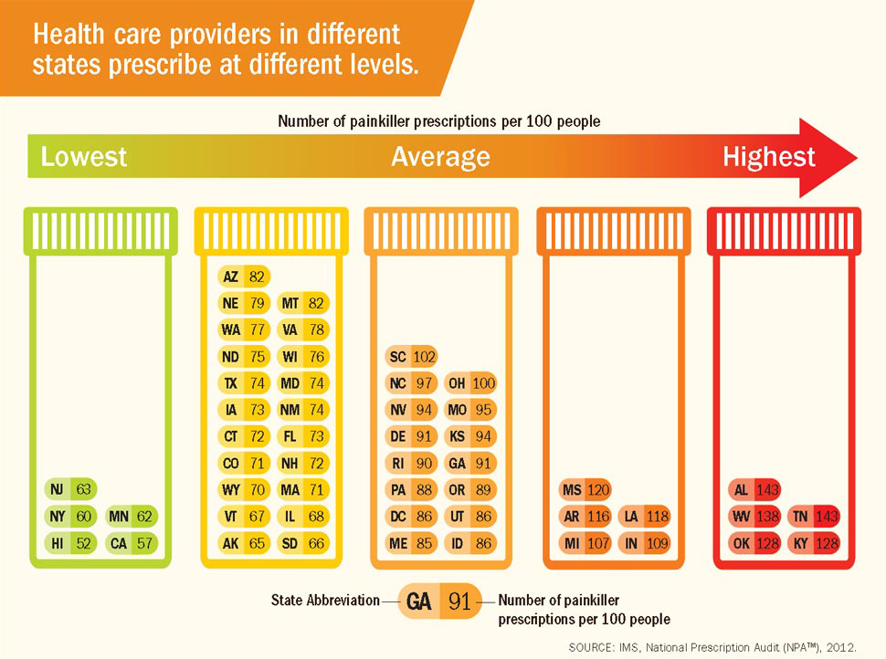 Prescriptions were distributed unevenly throughout the United States—health care providers in the highest prescribing state wrote almost three times as many opioid painkiller prescriptions per person as those in the lowest prescribing state, CDC’s Vital Signs reported. Southern states, especially Alabama, Tennessee, and West Virginia, had the most painkiller prescriptions per person.