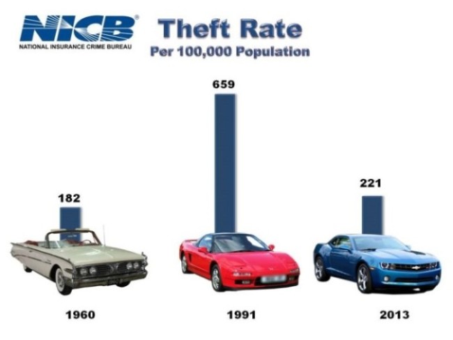 Just released FBI crime figures for 2013 show that 699,594 vehicles were reported stolen last year—a 58 percent reduction—from 1991 when vehicle theft reached an all-time high of 1,661,738, according to the National Insurance Crime Bureau which released a national analysis of vehicle theft which compares annual statistics for thefts, population and vehicle registrations from 1960 through 2013.