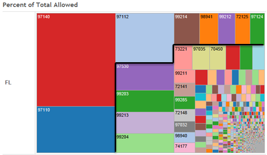 By limiting investigation to the top 10 procedure codes the user is not overwhelmed by a vast dataset with many false positive findings that delay appropriate conclusions; rather they are left with a clear picture of the medical community’s treatments of choice and how these services are driving results in a particular state of jurisdiction. Simply mapping this high level snapshot of what the top 10 procedure codes represented of total allowed for the state of jurisdiction starts to paint a picture where patterns may drive organizational alignment and on time training.
