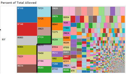 Through the use of a heat mapping tool you quickly see the variability between states of jurisdiction. Understanding that nearly 70 percent of all professional medical services in Oregon are due to ten procedures while in New York the top 10 procedure codes only represent 33 percent of total allowed affords a claim organization the opportunity to make decisions from a position of strength. If a claim organization was looking to consolidate claims or introduce an expedited claim handling process they might want the less experienced claim handlers assigned to Oregon claims or pilot their new claim process on Oregon claims since the majority of claim cost is associated with ten procedure codes.
