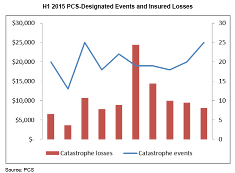 First-half catastrophe losses came to $8.1 billion from 26 events. PCS has published its full North American catastrophe summary in Barely a Whisper: PCS Q2 2015 Catastrophe Review, a report available to users of the loss aggregation service.
