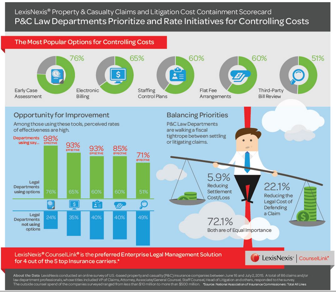 According to a recent LexisNexis/CounselLink survey of 86 property/casualty claims and law departments, controlling defense costs was the key initiative for 2015 and 2016.