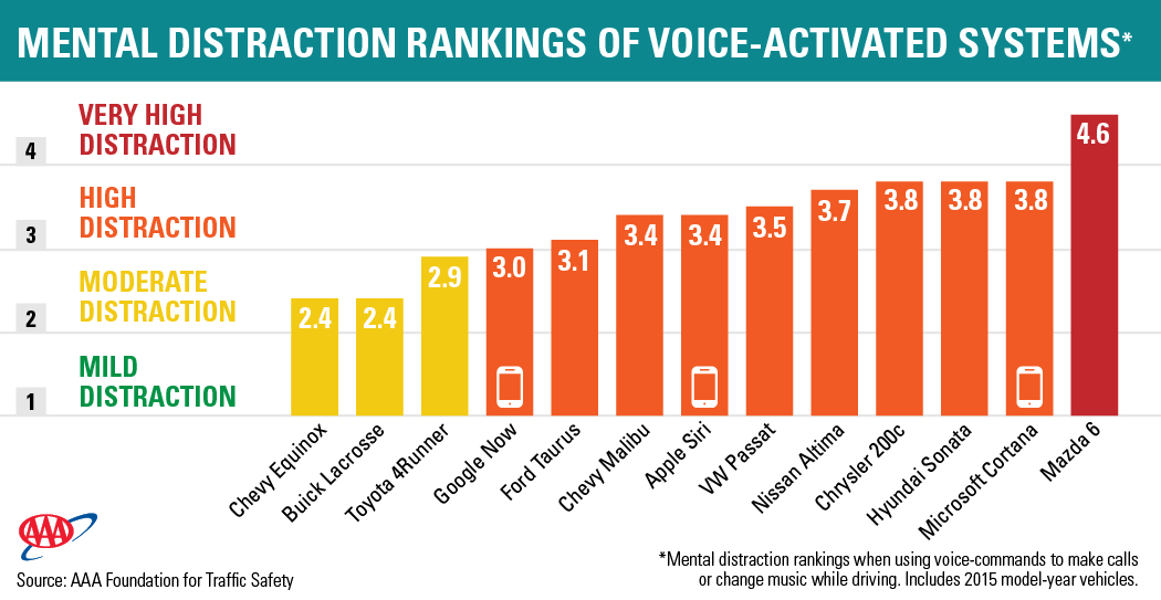 In some cases, the same voice-command system (like Chevy MyLink) got different distraction scores in different models – something the researchers speculate is due to varying amounts of road noise and use of different in-vehicle microphones.