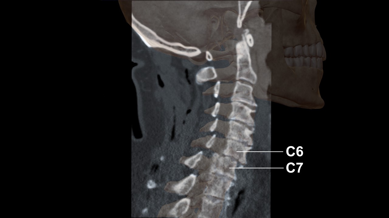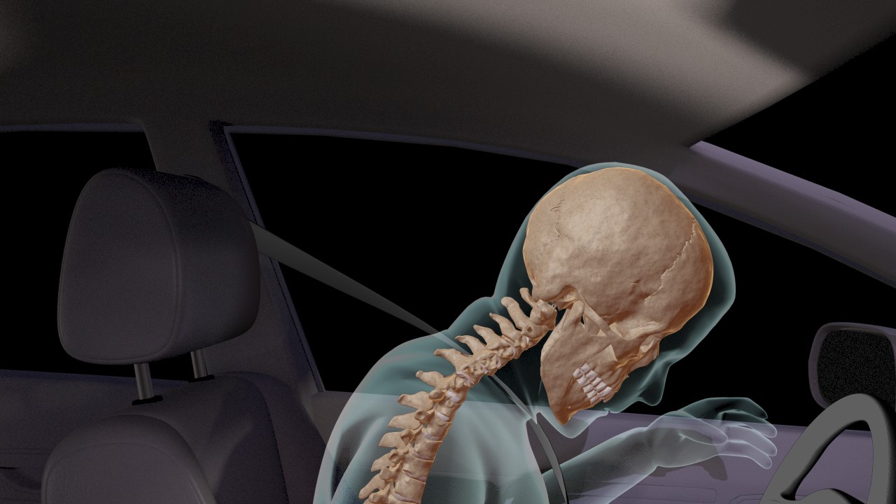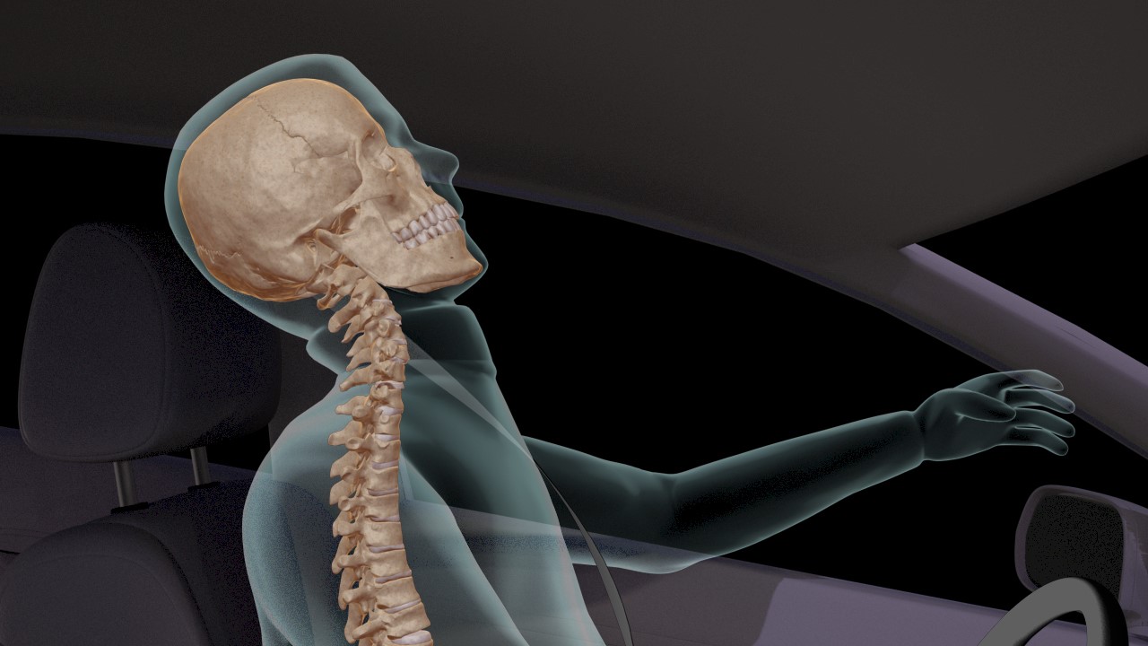 The still-rendered Image B shows the behavior of the human body, specifically the spine, at the moment of impact. The image then transforms to show the injuries that were immediately sustained and the post-accident procedures needed.