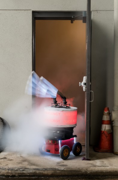 When the test subjects opened the conference room door, they saw the smoke – and the robot, which was then brightly-lit with red LEDs and white “arms” that served as pointers. The robot directed the subjects to an exit in the back of the building instead of toward the doorway – marked with exit signs – that had been used to enter the building.