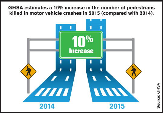 There were 2,368 pedestrians killed in the first six months of 2015, compared to 2,232 during the same period in 2014 – a six percent increase. Researchers arrived at a 10 percent increase for the entire year by factoring in that fatalities for the first half of the year are typically underreported, and that for at least the last five years an average of 25 percent more pedestrian deaths were recorded in the second half of the year, which includes warmer summer months, Retting said.