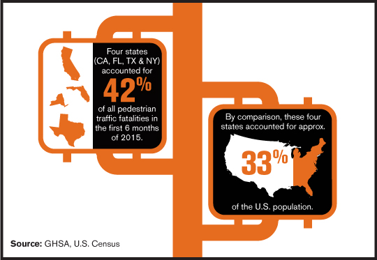 Four large population states – California, Florida, Texas and New York – accounted for 42 percent of the pedestrian deaths in the first six months of 2015. States with the highest rate of pedestrian fatalities per 100,000 residents were scattered across the country – Florida, 1.35; Arizona, 1.27; Delaware, 1.27; South Carolina, 1.12; Mississippi, 1.07; Oregon, 1.04, and New Mexico, 1.01. The District of Columbia also tied Oregon for the sixth highest rate, 1.04.