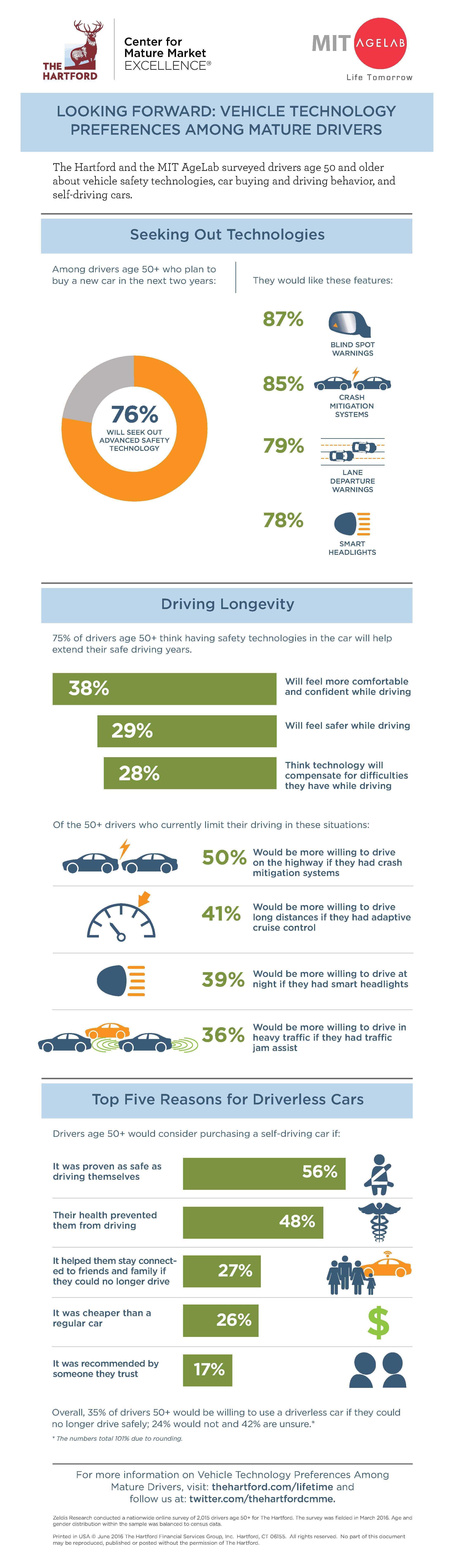 The survey suggests “they associate advanced technologies with enhanced safety,” said Jodi Olshevski, a gerontologist and executive director of the Hartford Center for Mature Market Excellence, a unit of The Hartford. “It is encouraging that a majority of mature drivers planning their next vehicle purchase will purposely seek out high-tech safety features.”