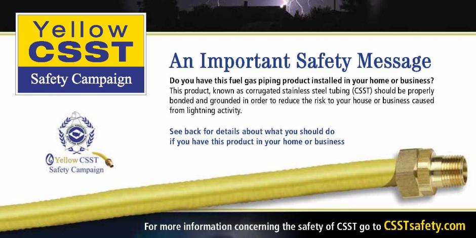 Lightning strikes occur approximately 25 million times each year in the U.S., as reported by the National Severe Storms Laboratory. As summer approaches, storm producing lightning strikes could threaten millions of homes nationwide, according to Jim Narva, executive director of the National Association of State Fire Marshals (NASFM). That’s because millions of homes built in the 1990’s contain yellow corrugated stainless steel (CSST) tubing.