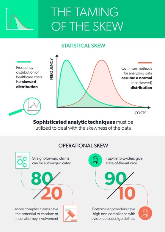It’s essential to keep this in mind in any analytic effort with healthcare data, especially in workers’ compensation. To get the required level of accuracy, we need to think “non-normal” and get comfortable with the “skewed” behavior of the data.