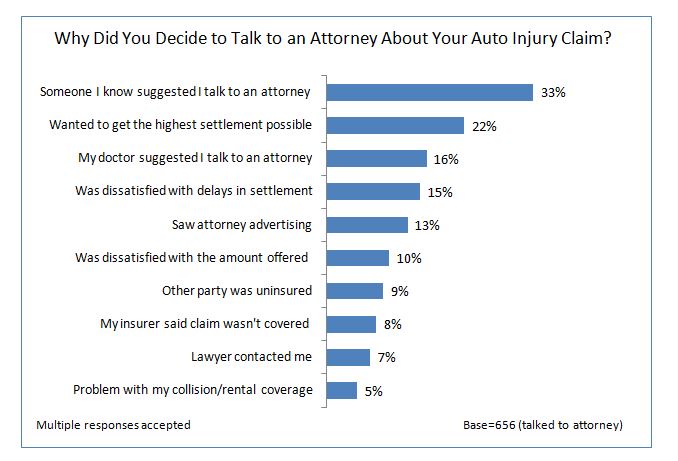 In a recent online poll about experiences with auto injury insurance claims, almost half of respondents with auto injury claims hired attorneys to help settle those claims, according to a survey commissioned by the Insurance Research Council. The most common reasons for talking to attorney did not involve dissatisfaction with the claim process. Only 15 percent of auto injury claimants who talked to an attorney said that they did so because of delays in getting the claim settled, and 10 percent said it was because they were unhappy with the settlement amount offered. Instead, it was more common for respondents to say that they talked with an attorney because it was suggested to them, either by someone they know (33 percent) or by their doctor (16 percent). Another common reason was that they wanted to get the highest settlement possible, cited by 22 percent of respondents.