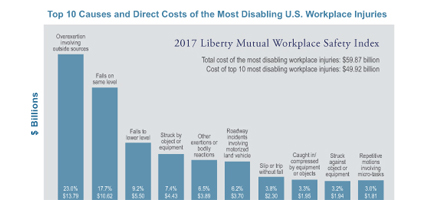 “Each year, we rank the top 10 causes of the most serious, nonfatal workplace injuries by their direct costs to help companies better protect employees and the bottom-line,” notes Debbie Michel, who leads the area of Liberty Mutual that provides workers compensation and other insurance coverages to mid-sized and large companies through brokers and agents.