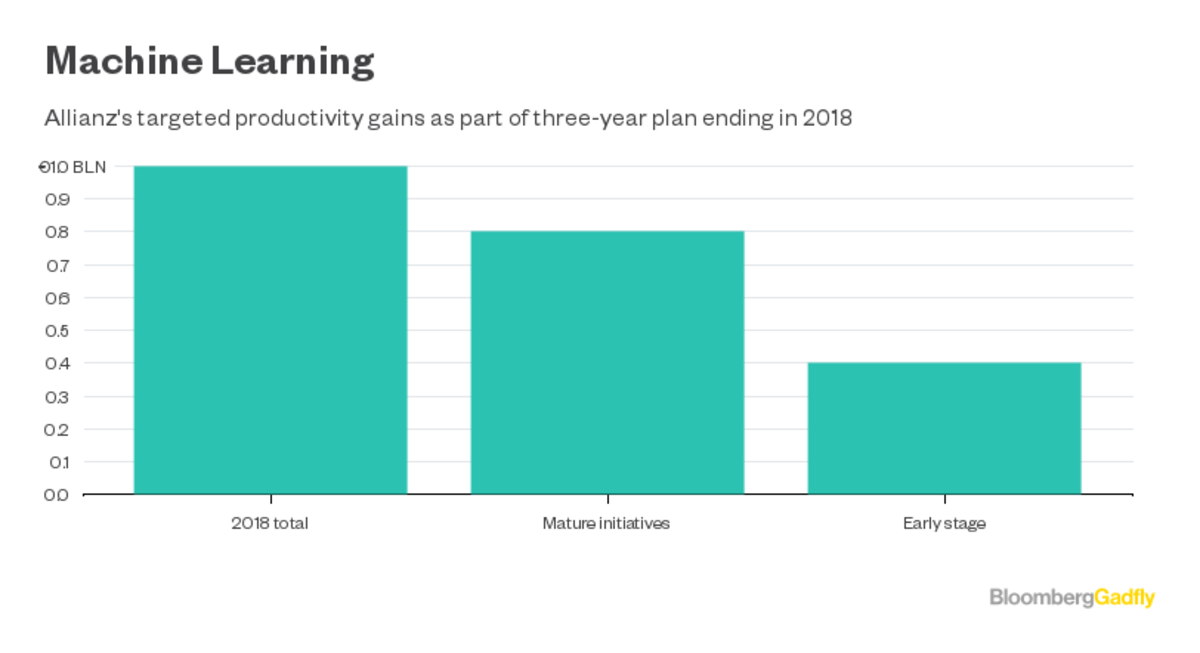 Allianz SE expects digitization will help it generate 1 billion euro of yearly productivity gains in its current three-year plan. Even though its earnings per share growth will be helped by a $3.2 billion share buyback, it knows it has to dig out more savings over the long term. The industry as a whole would do better by automating back-office functions, says McKinsey.