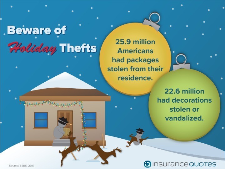 “During the holidays, certain crimes and home hazards increase. Homeowners need to take precautions and make sure they have the right insurance to protect their finances,” said Laura Adams, senior insurance analyst at insuranceQuotes. “You could have packages delivered to your office or a local locker—or use motion detectors, security systems and light timers to fend off thieves.”