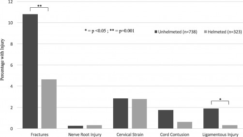 Bar graph showing the characterization and distribution of cervical spine injuries in helmeted & unhelmeted riders after motorcycle crashes