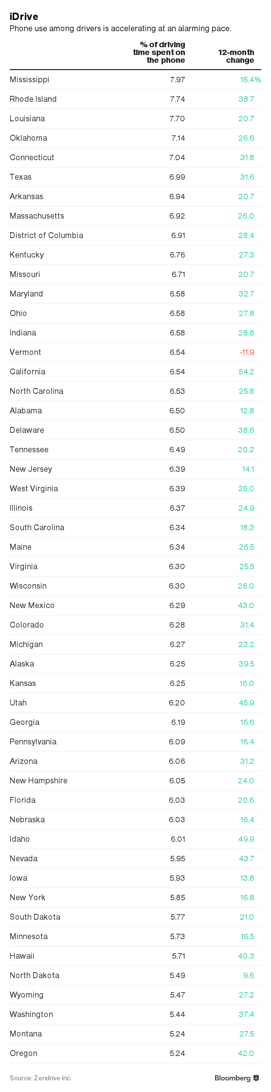 Vermont was the only U.S. state in which Zendrive recorded a decline in drivers on phones. In Mississippi and Rhode Island, the worst states for distracted driving, subject drivers spent almost 8 percent of their time on the phone. Rhode Island, in particular, may provide an interesting test case when its hands-free law takes effect this summer.