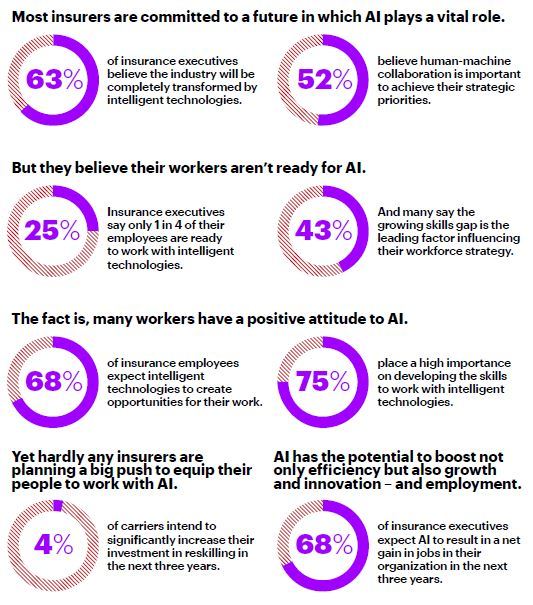 “AI has the potential to boost innovation, growth and efficiency, but insurers’ hesitance to properly reskill their employees could limit its impact,” said Michael Costonis, who leads Accenture’s Insurance practice globally. “To complicate matters, despite having a business that is ripe to apply technology and innovation, insurers aren’t in a good position to win the war on technology talent. Executives need to think pragmatically about how they can bring new talent in, redesign jobs and reskill existing employees appropriately. Creating a more-flexible work environment could be a key first step to attracting data scientists and other outside talent.”
