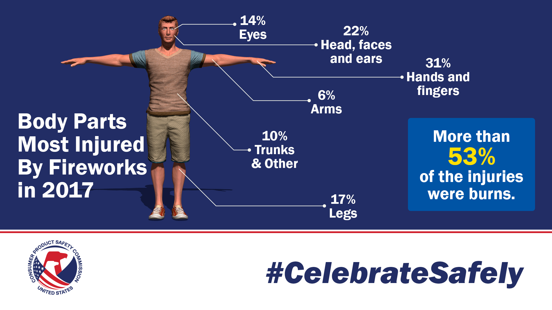 About two-thirds of the 11,000 to 13,000 fireworks-related injuries reported each year happen around the July Fourth holiday — between mid-June to mid-July.