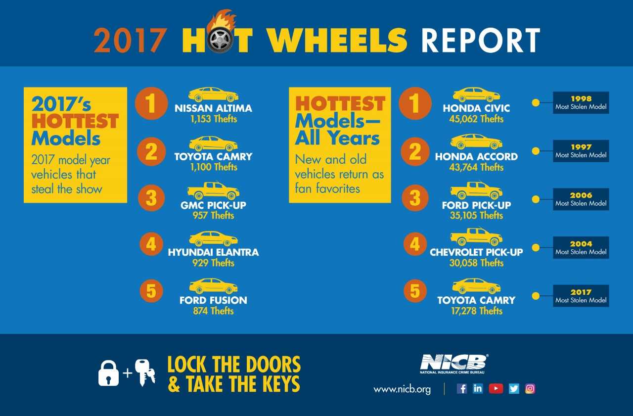 Anti-theft technology continues to show its effectiveness at thwarting would-be car thieves. The National Insurance Crime Bureau (NICB) released its annual Hot Wheels report, identifying the 10 most stolen vehicles in the United States. The report examines vehicle theft data submitted by law enforcement to the National Crime Information Center and determines the vehicle make, model and model year most reported stolen in 2017.