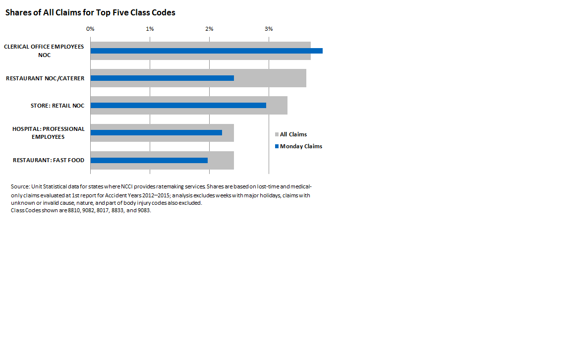 Classes, too, can affect the distribution of claims by day of the week. The report found that clerical office employees – the largest classification – reported the most Monday claims and the most injury claims overall. In addition, restaurant and retail workers reported more claims on the weekend, than during the typical five day work week. The authors state this likely due to work patterns associated with these classes.