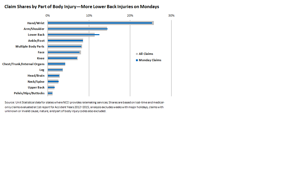 The NCCI report also looked at the types of injuries claims on Mondays to see if certain injuries were more likely to be reported on that day of the week. The authors found that lower back injuries and strains represented a greater share of Monday claims, though there was no impact resulting from whether workers were uninsured or not.