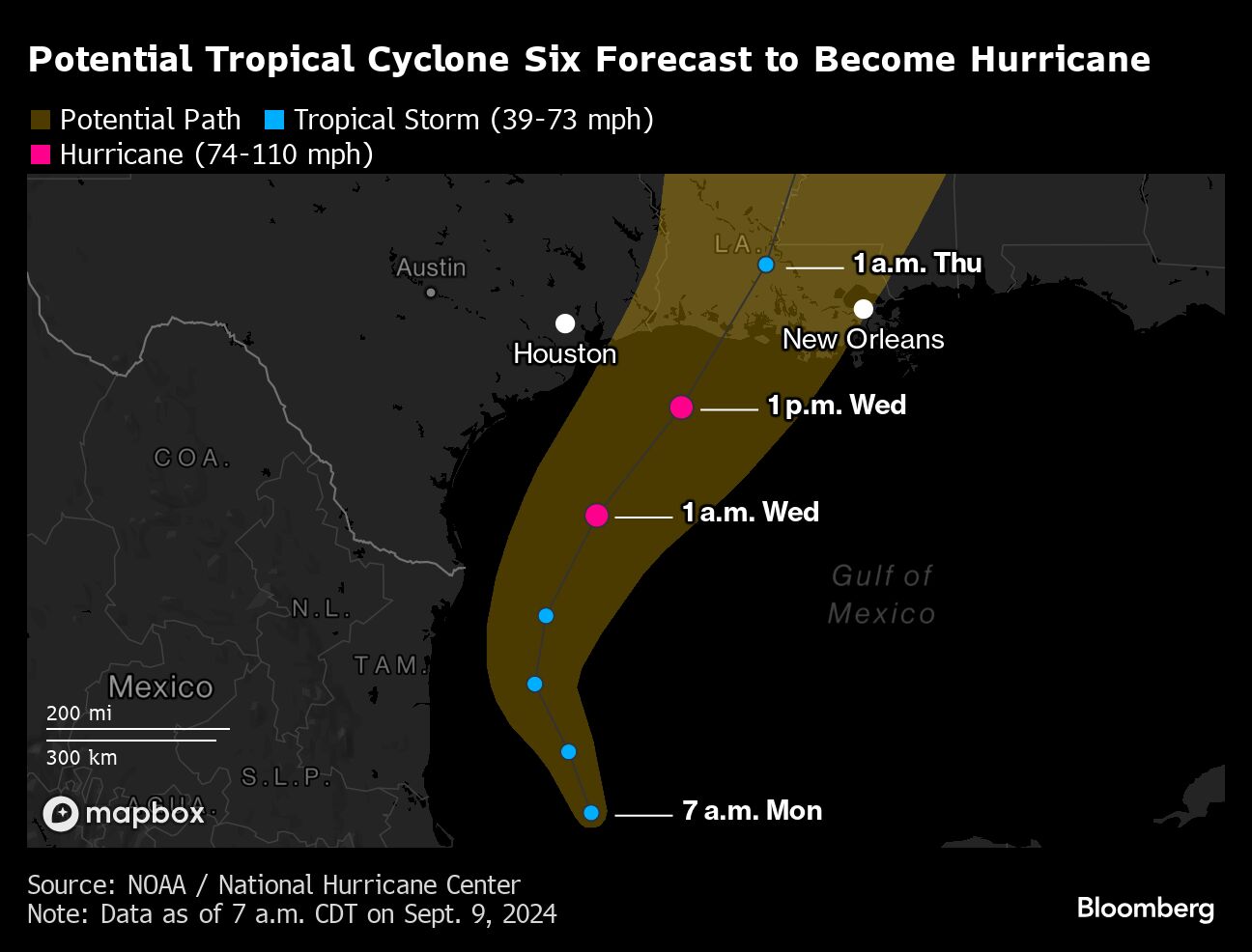 This will be the second storm to form in the western Gulf and the third to hit the US mainland this year. It’s forecast to peak as Category 1 storm on the five-step Saffir-Simpson scale as it rolls through the region’s oil and gas platforms, said Adam Douty, a meteorologist at commercial-forecaster AccuWeather Inc.