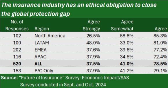 Just over 78% agreed with the statement, “The insurance industry has an ethical obligation to close the global protection gap,” with 37.5% saying they “agree strongly” and 41% agreeing “somewhat.”