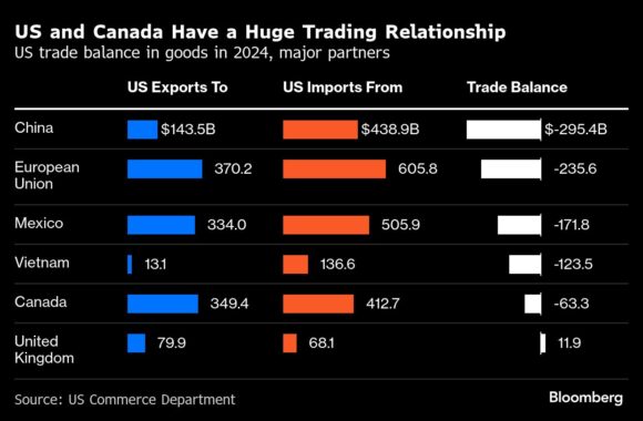 The Trump administration imposed 25% tariffs on all Canadian imports to the US on Tuesday, with the exception of energy products such as oil and natural gas, which have a 10% rate. Trudeau’s government responded with levies against C$30 billion ($20.8 billion) in American products, including cosmetics, tires, fruit and wine.