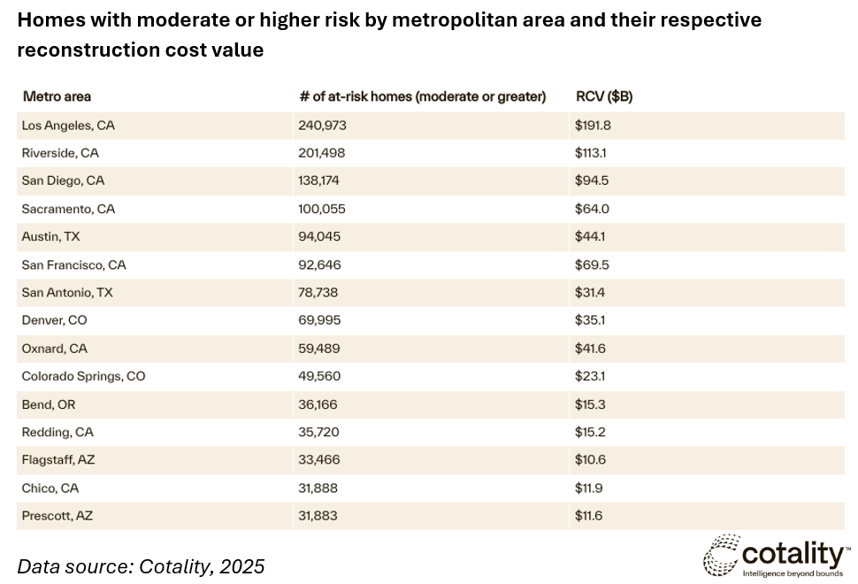 Cotality said these metros sit at the top of the list because of their homes’ proximity to nature. More homes are being built in the wildland-urban interface, the report said, where their adjacency to forested or undeveloped areas elevates their risk.