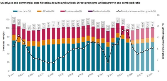 Looking ahead, S&P GMI expects auto insurance combined ratios to breach the breakeven level again in 2028, edging up to 97.1 in 2026 (matching 2024’s auto combined ratio) and 98.9 in 2027, according to the full report made available to Carrier Management.