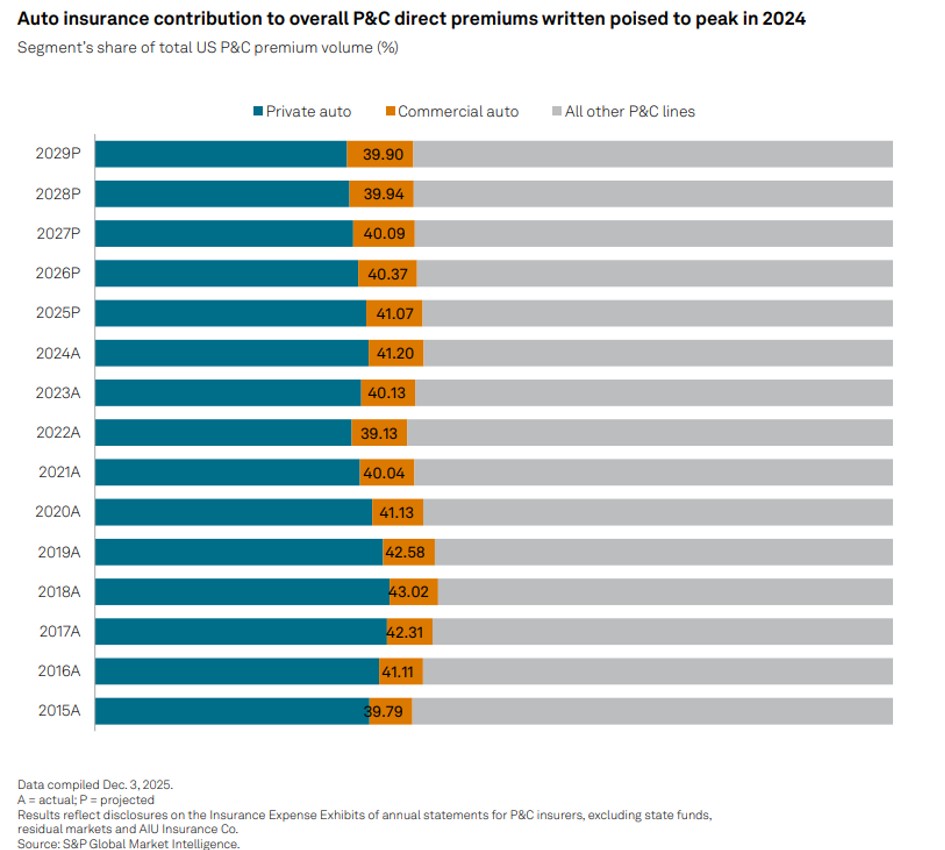 Together, S&P GMI estimates that private and commercial auto insurance will account for 41.1 percent of total U.S. P/C direct premiums written in 2025 when final results are tallied—slipping down slightly from a five-year high of 41.2 percent achieved in 2024, reflecting the impact of competition emerging in the private auto market.