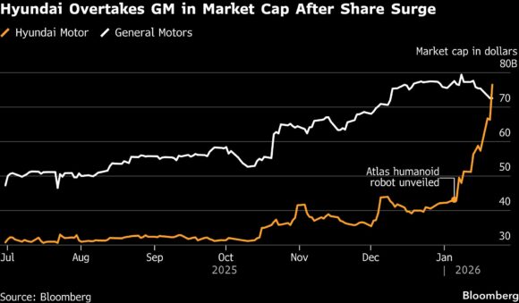 Hyundai Motor Co. overtook General Motors Co. as the world’s fourth-most valuable automaker as the South Korean firm’s robotics push fuels a blistering stock rally.