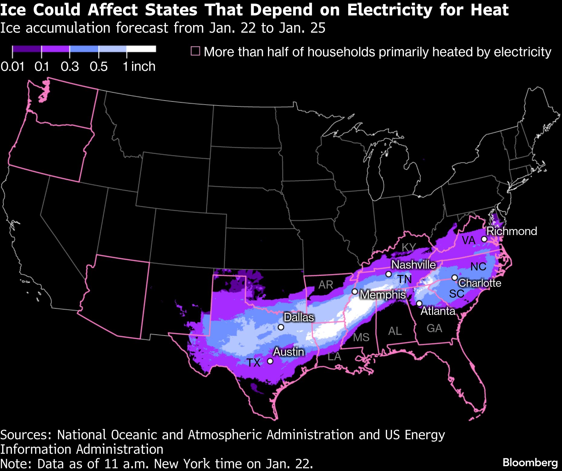 Ice Could Affect States That Depend on Electricity for Heat | Ice accumulation forecast from Jan. 22 to Jan. 25