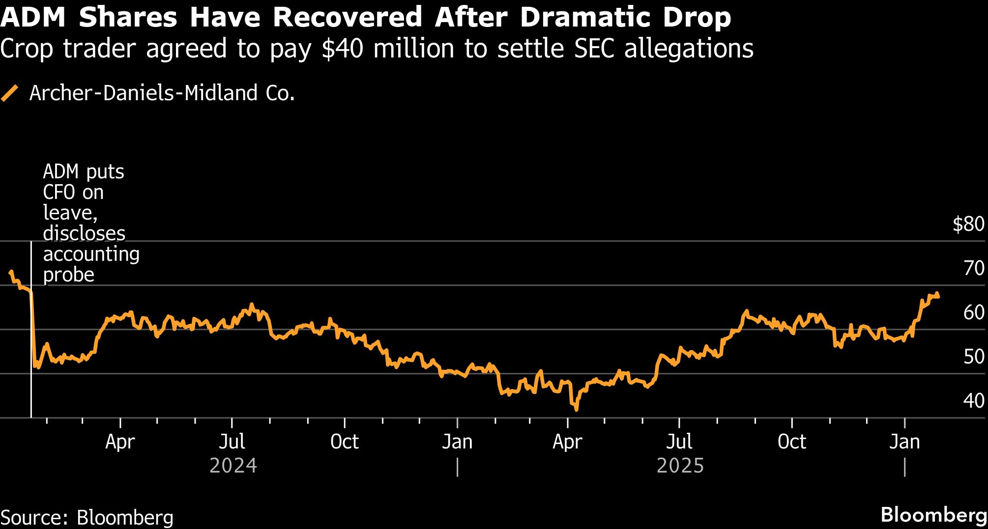 ADM lost as much as $16 billion of market value as shareholder trust was eroded and the company restated and corrected its earnings. The shares touched an almost five-year low last April. They have since rebounded to regain all of those losses as of Tuesday’s close. On Wednesday, ADM was down 1.3% at 3:50 p.m. in New York.