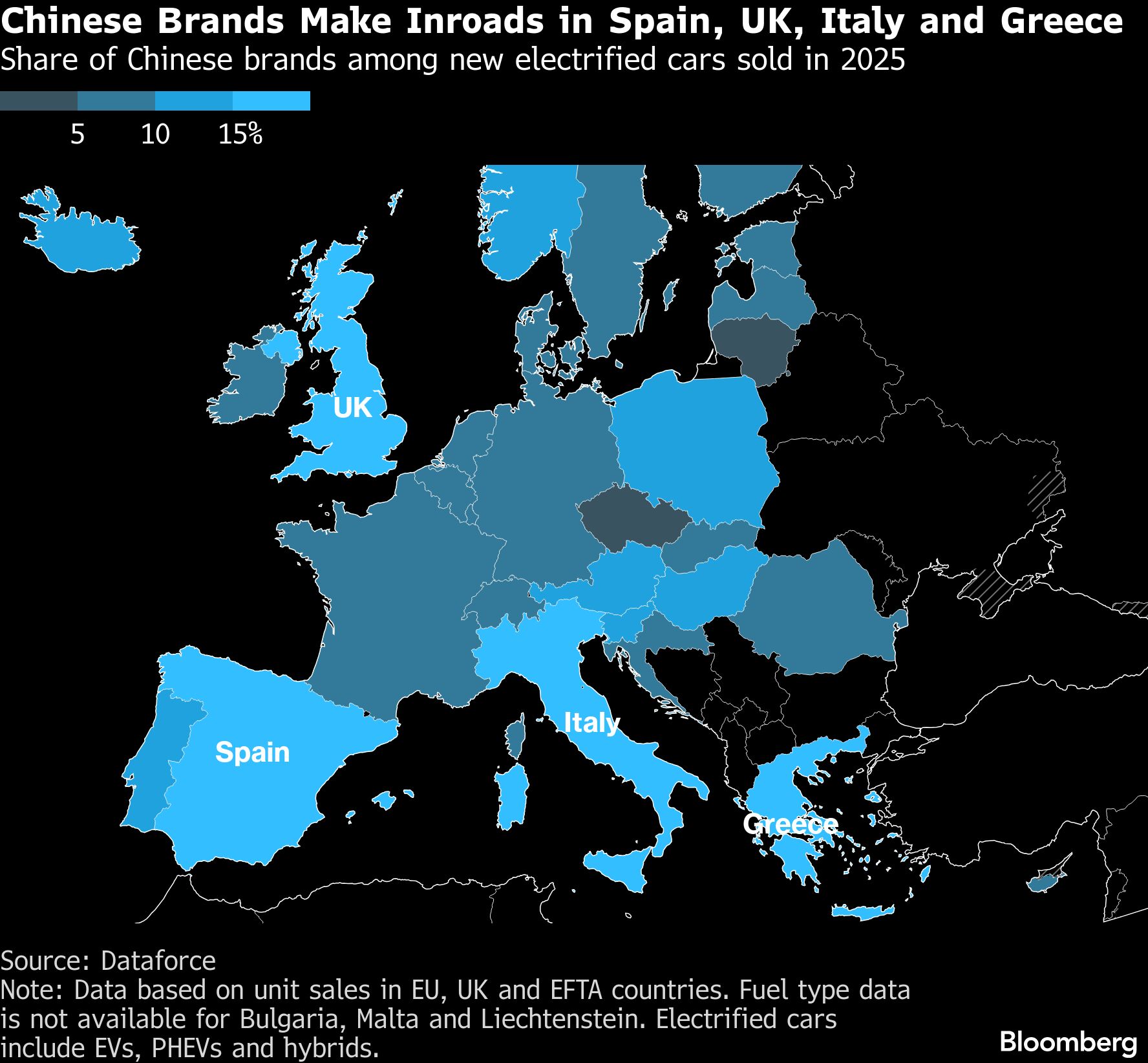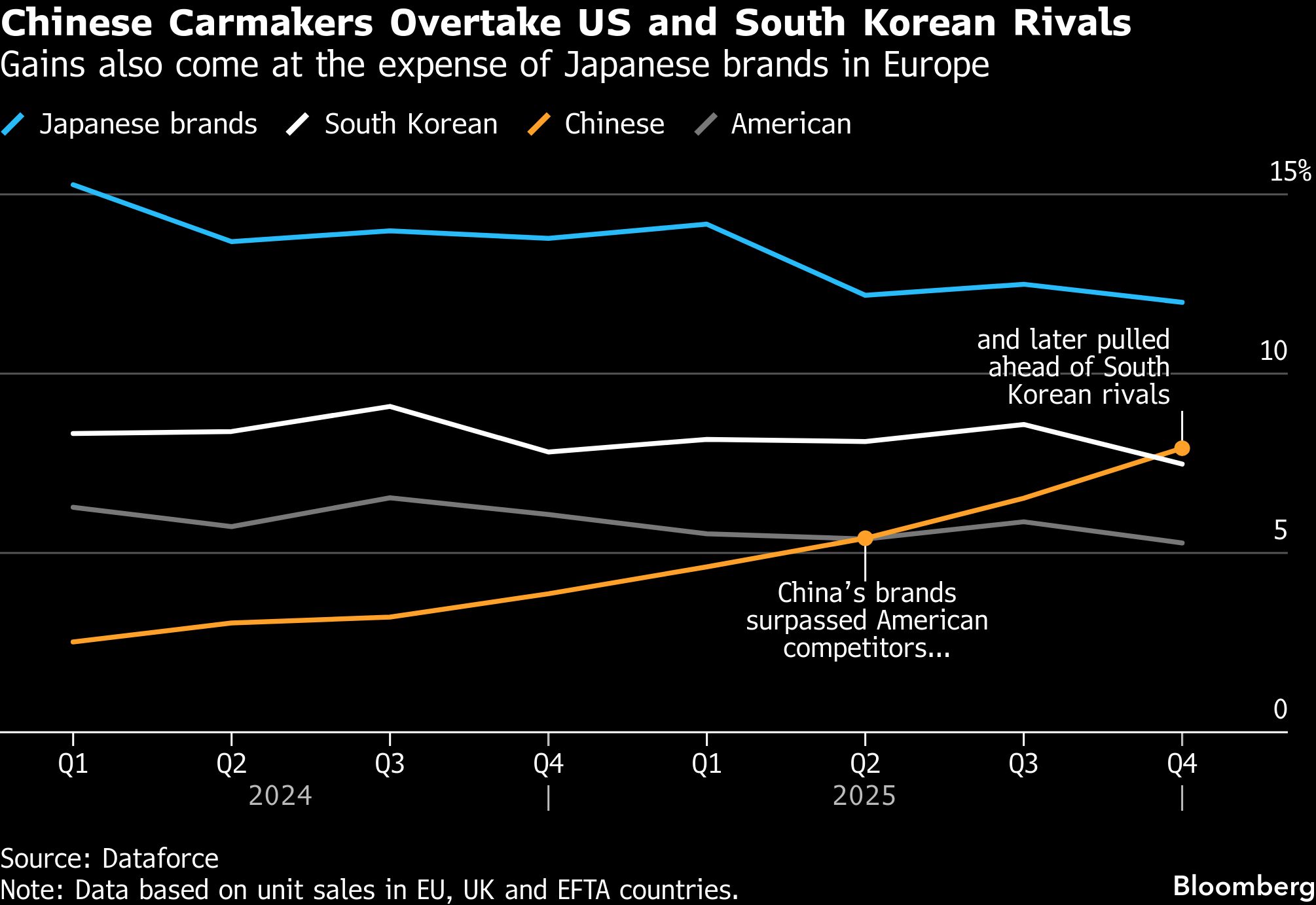 Non-European brands that have built factories in the region and nurtured dealer networks for decades face being squeezed out by China’s momentum. Chinese brands overtook US carmakers in the region during the second quarter of 2025, and surpassed South Korean companies in the fourth quarter, according to Dataforce.