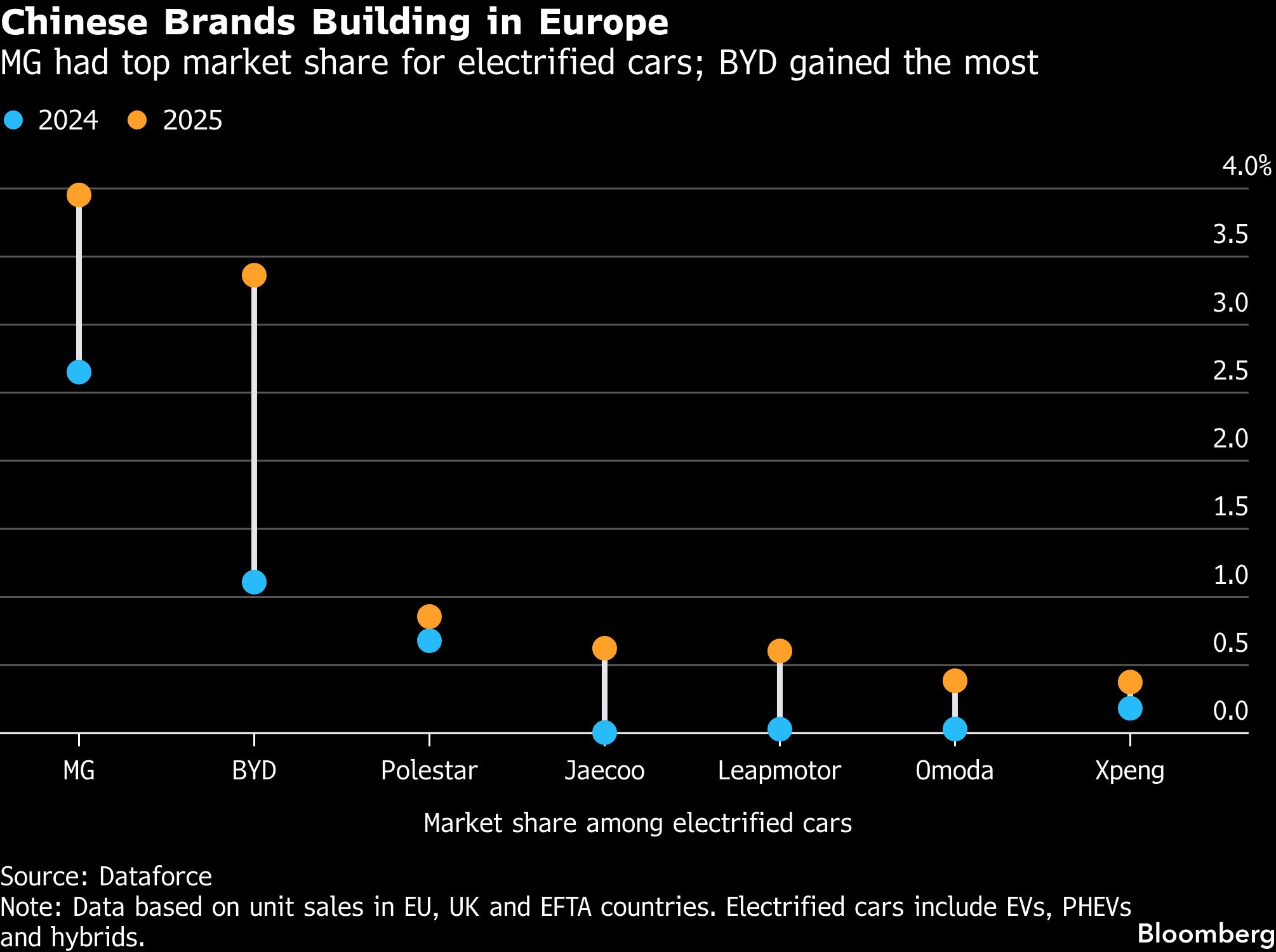 Chinese brands accounted for 16% of Europe’s electrified car market in December, and 11% for all of 2025, a Bloomberg analysis of the data shows — more than doubling from 2024. Zhejiang Leapmotor Technology Co. and Chery Automobile Co. put up significant volumes, joining incumbents BYD and MG maker SAIC Motor Corp.