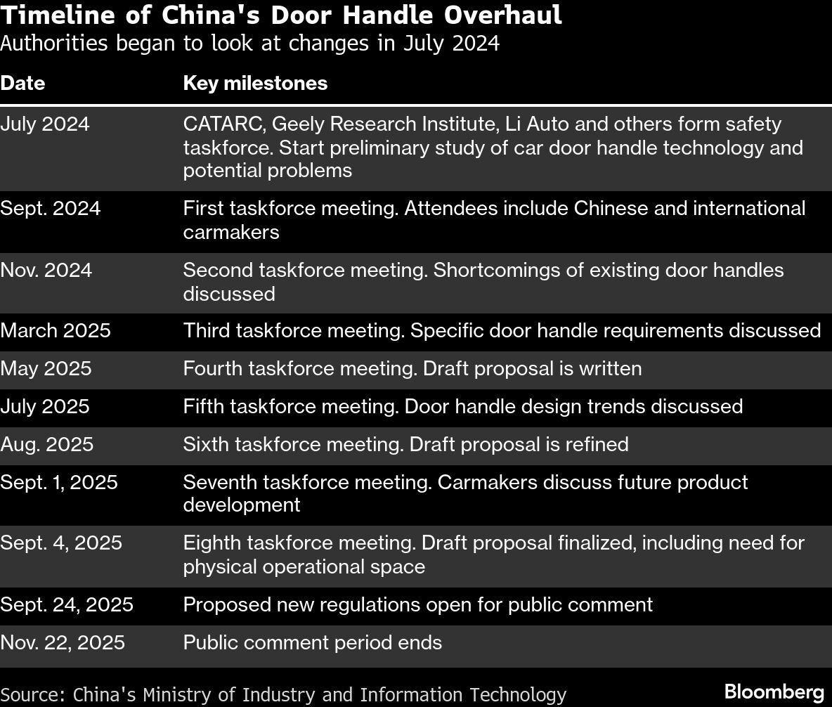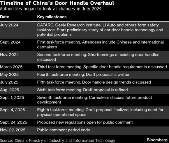 That accelerated the push to regulate handles, but their safety has long been a topic of debate in the industry. China’s examination of standards began in July 2024 following at least two fatal EV crashes in which people were trapped in their cars due to issues opening doors.