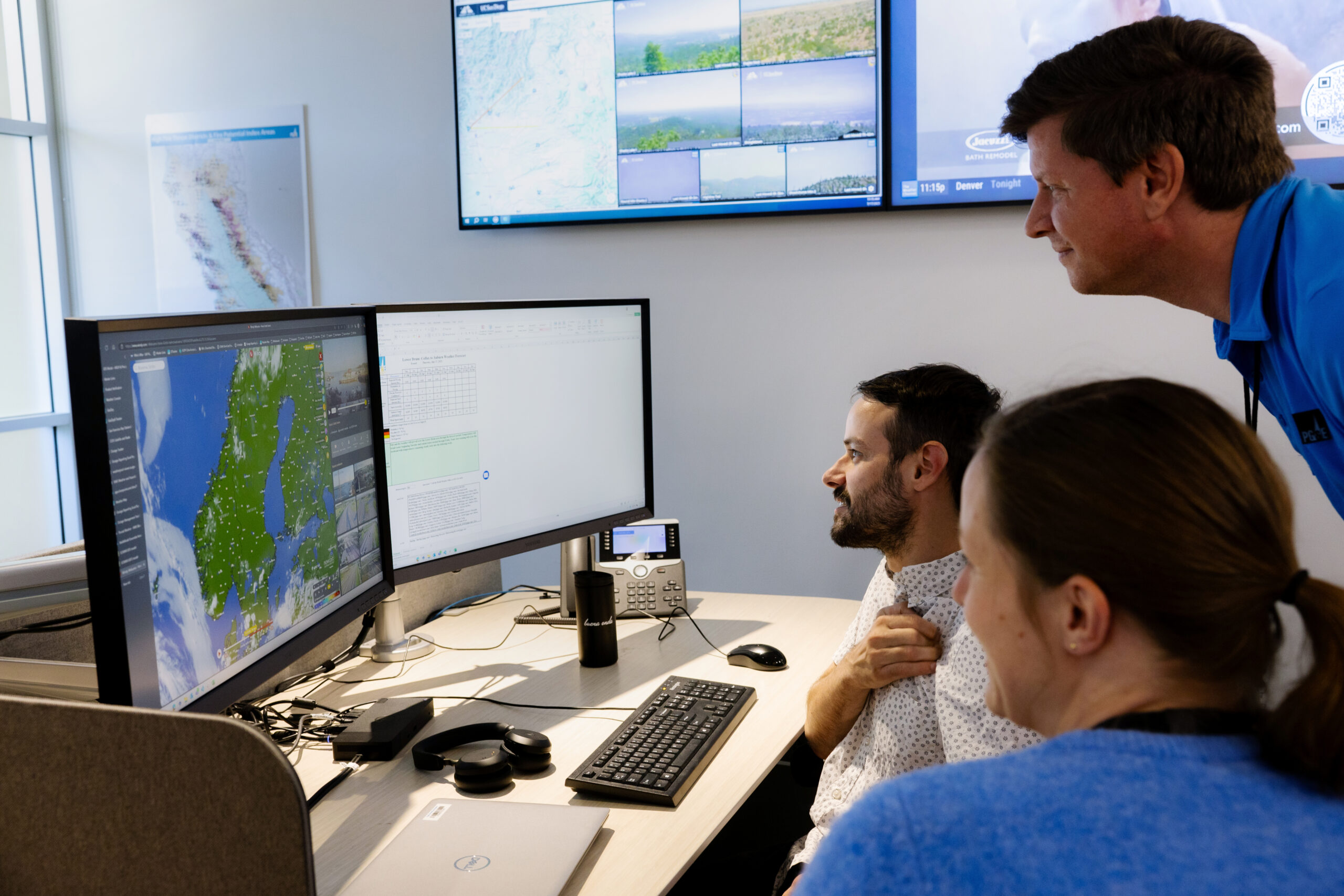 Top photo: Scott Strenfel in the Meteorology and Fire Science room. Photographer: Manuel Orbegozo/Bloomberg.