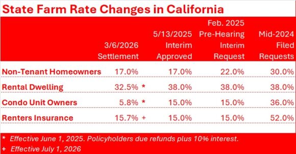 Both CDI and Consumer Watchdog, which served as intervenor in accordance with provisions of Proposition 103, announced the three-party settlement agreement late on Friday. State Farm has not posted an announcement about rates for residential property policies but did announce a 6.2% rate reduction for auto insurance of State Farm Mutual Auto in California earlier in the week.