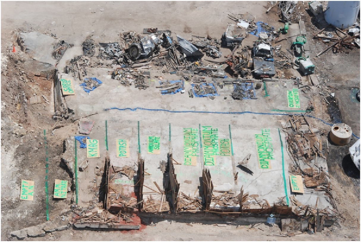According to the report, the building contained bins of ammonium nitrate pellets – about 20-30 tons – and other bulk chemicals.